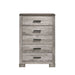 Features: • Five Spacious Drawers • 3D Distressed Paper Finish • Velvet, Lined Top Drawer • Dark Gray Top • Light Gray Color Dimensions: ...