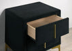 FLORIZEL Night Stand, Black, 22 1/4"W X 14 3/8"D X 24 1/4"H, 35.3lbs. Coming in a bold color, this night stand stays true to its glam roots. Between the classy, upholstered soft flannelette and the gold-coated steel legs, it is designed for the sophisticated urbanite and their modern city oasis.