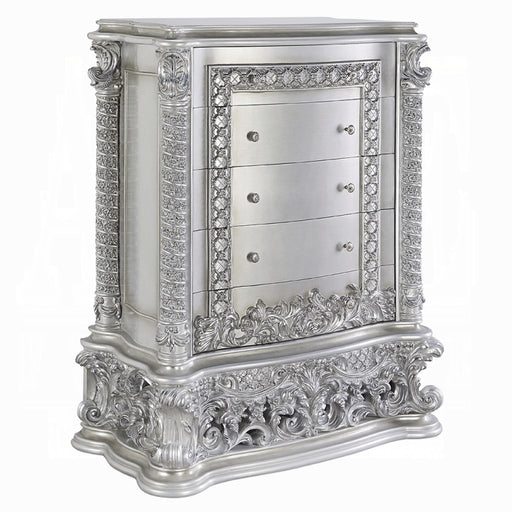 Luxurious style, sophisticated charm, and lustrous finishes are all included in the Vanaheim Bedroom Collection. Extravagant scroll floral design...